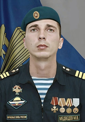 ![]() Медведев Максим Владимирович (1988 – 2022) Участник специальной военной операции, гвардии сержант Родился в г. Городовиковске Республики Калмыкия. Срочную службу проходил в 2007-2009 гг. в 159-м истребительном авиационном полку на должности механика силовых и осветительных систем (Республика Карелия). Затем служил в вооружённых силах по контракту на территории Чеченской Республики. С 2014 г. служил в 247-м гвардейском десантно-штурмовом полку (г. Ставрополь). В 2015 г. участвовал в составе сборной России в Первых Армейских Международных Играх, в категории «Десантный взвод» его команда заняла второе место. В 2018 г. принимал участие в военных действиях в Сирии. Погиб в первый день специальной военной операции 24 февраля 2022 г. при выполнении боевых задач у г. Новая Каховка Херсонской области. Награждён орденом Мужества (посмертно), медалями «За ратную доблесть», «Участнику военной операции в Сирии». Его именем названа одна из улиц г. Михайловска Ставропольского края | ![]() Зубко Тимофей Семёнович (1908 – 1995) Участник Великой Отечественной войны, рядовой (прадед М.В. Медведева по материнской линии) Родился в с. Дмитриевка ныне Красногвардейского района Ставропольского края. Затем переехал в п. Башанта Ростовской области, откуда был призван в марте 1941 г. в ряды Красной Армии. На фронте с мая 1942 г. Воевал в должности пулемётчика в составе 10-го стрелкового полка 6-й гвардейской стрелковой дивизии. В сентябре 1942 г. получил тяжёлое ранение, приведшее к ампутации ноги. В августе 1943 г. был демобилизован по ранению. Награждён орденами Отечественной войны I степени, Красной Звезды, медалью «За отвагу» | ||